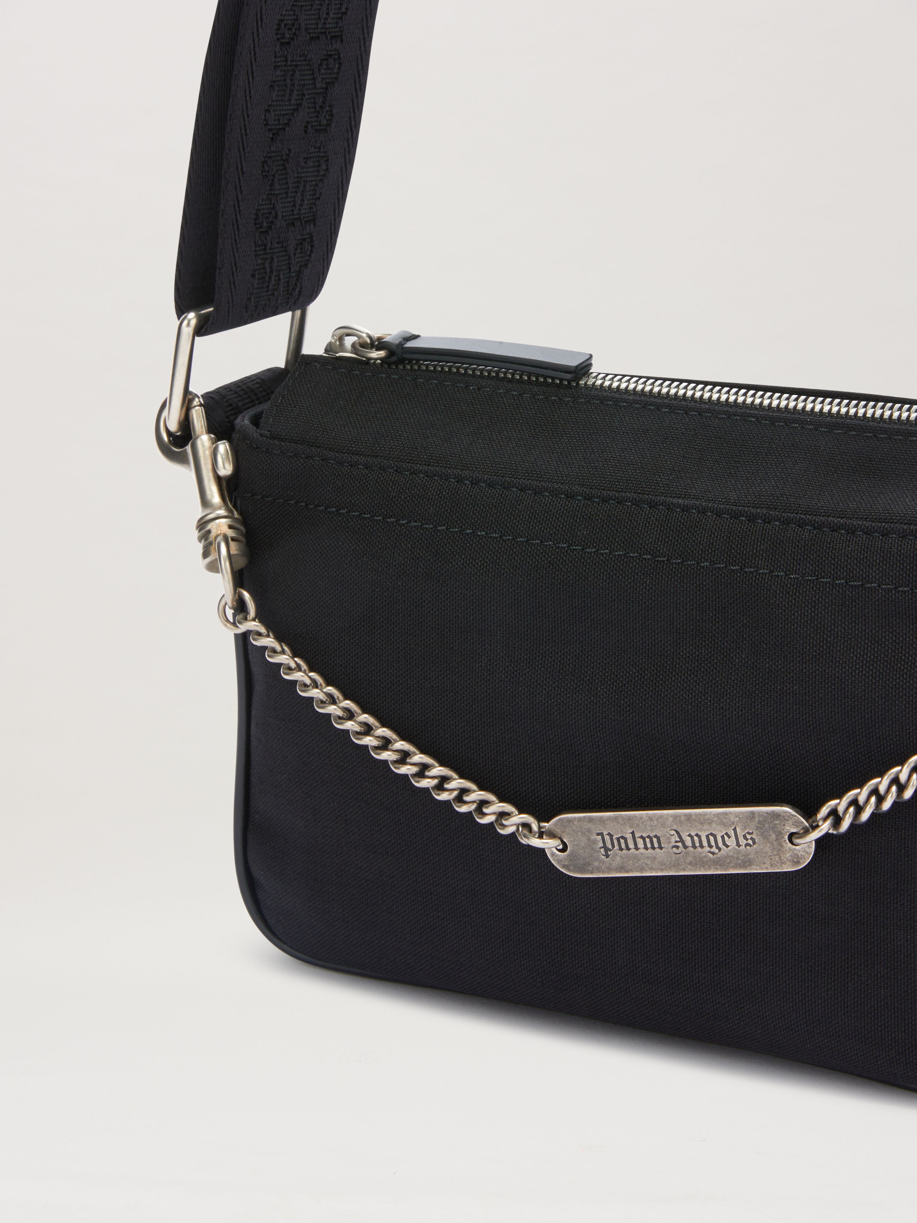 Metallic hardwear as a unifying element among accessories. Men's black crossbody bag with strap and metal details, featuring snap